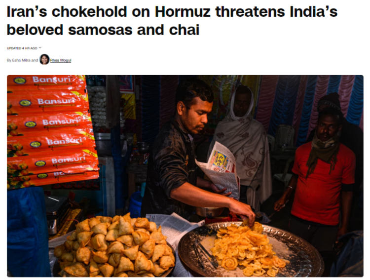 美伊冲突导致霍尔木兹海峡被封锁后配资网站首页,对全球经济产生了重大影响,而最新的“受害者”是印度街头的奶茶和咖喱角。